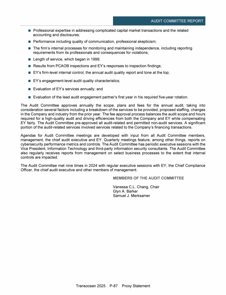 Agenda Item 1. Approval of (A) the 2024 Annual Report, Including the Audited Consolidated Financial Statements of Transocean Ltd. for Fiscal Year 2024 and the Audited Statutory Financial Statements of Transocean Ltd. for Fiscal Year 2024, (B) the Swiss Statutory Compensation Report for Fiscal Year 2024 and (C) the Swiss Statutory Report on Non-Financial Matters for Fiscal Year 2024
