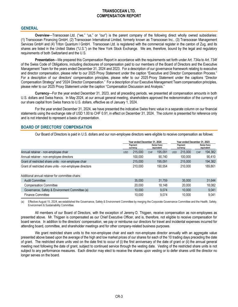 Agenda Item 1. Approval of (A) the 2024 Annual Report, Including the Audited Consolidated Financial Statements of Transocean Ltd. for Fiscal Year 2024 and the Audited Statutory Financial Statements of Transocean Ltd. for Fiscal Year 2024, (B) the Swiss Statutory Compensation Report for Fiscal Year 2024 and (C) the Swiss Statutory Report on Non-Financial Matters for Fiscal Year 2024