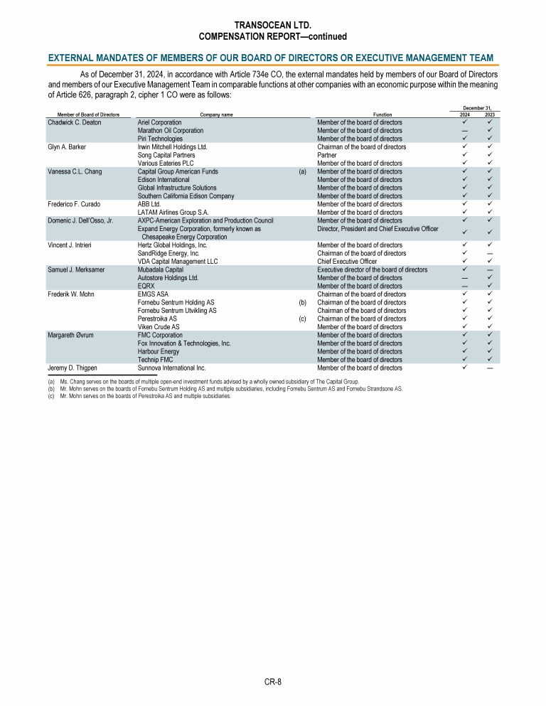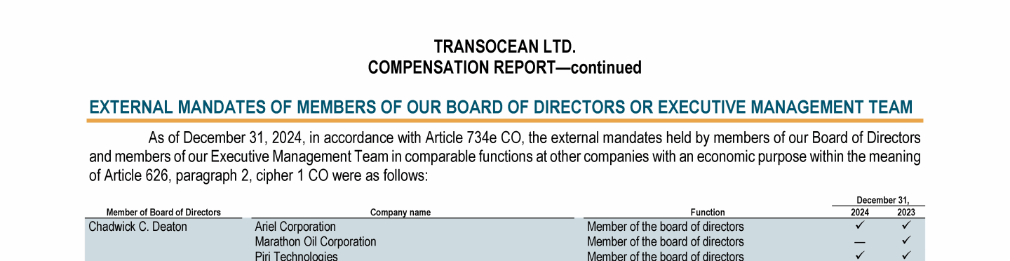 Agenda Item 1. Approval of (A) the 2024 Annual Report, Including the Audited Consolidated Financial Statements of Transocean Ltd. for Fiscal Year 2024 and the Audited Statutory Financial Statements of Transocean Ltd. for Fiscal Year 2024, (B) the Swiss Statutory Compensation Report for Fiscal Year 2024 and (C) the Swiss Statutory Report on Non-Financial Matters for Fiscal Year 2024