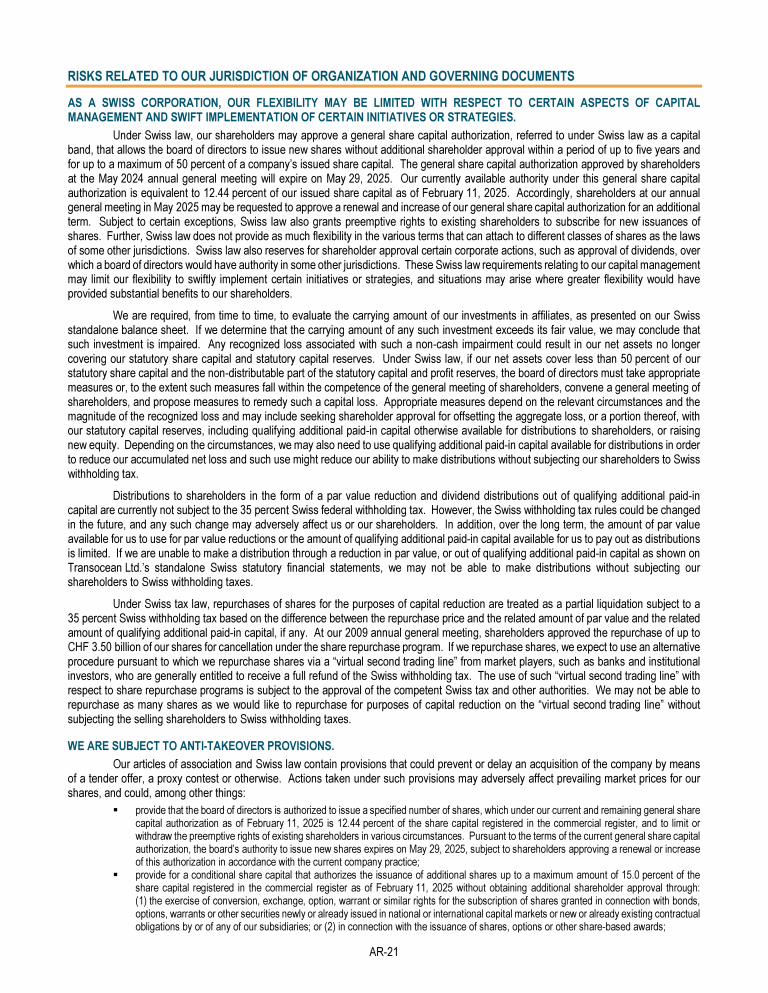 Agenda Item 1. Approval of (A) the 2024 Annual Report, Including the Audited Consolidated Financial Statements of Transocean Ltd. for Fiscal Year 2024 and the Audited Statutory Financial Statements of Transocean Ltd. for Fiscal Year 2024, (B) the Swiss Statutory Compensation Report for Fiscal Year 2024 and (C) the Swiss Statutory Report on Non-Financial Matters for Fiscal Year 2024