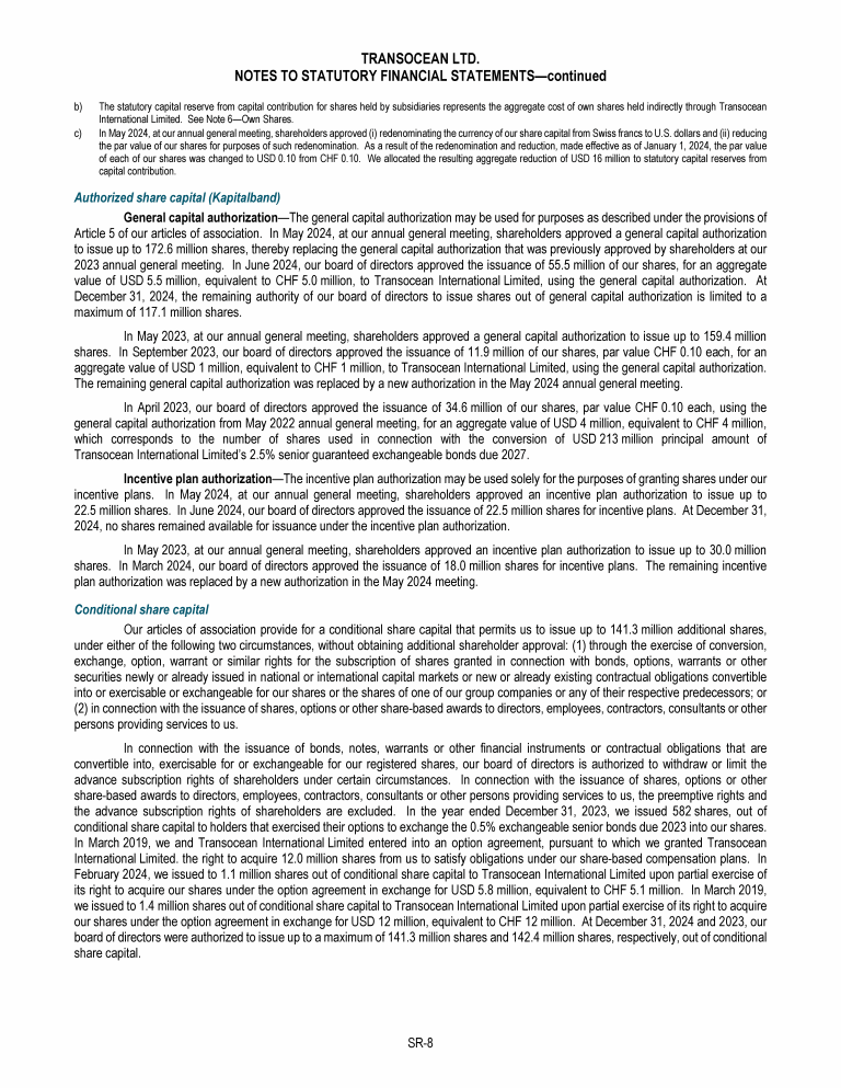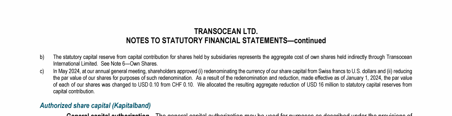 Agenda Item 1. Approval of (A) the 2024 Annual Report, Including the Audited Consolidated Financial Statements of Transocean Ltd. for Fiscal Year 2024 and the Audited Statutory Financial Statements of Transocean Ltd. for Fiscal Year 2024, (B) the Swiss Statutory Compensation Report for Fiscal Year 2024 and (C) the Swiss Statutory Report on Non-Financial Matters for Fiscal Year 2024