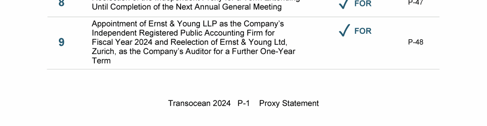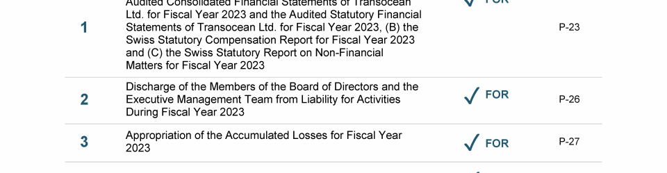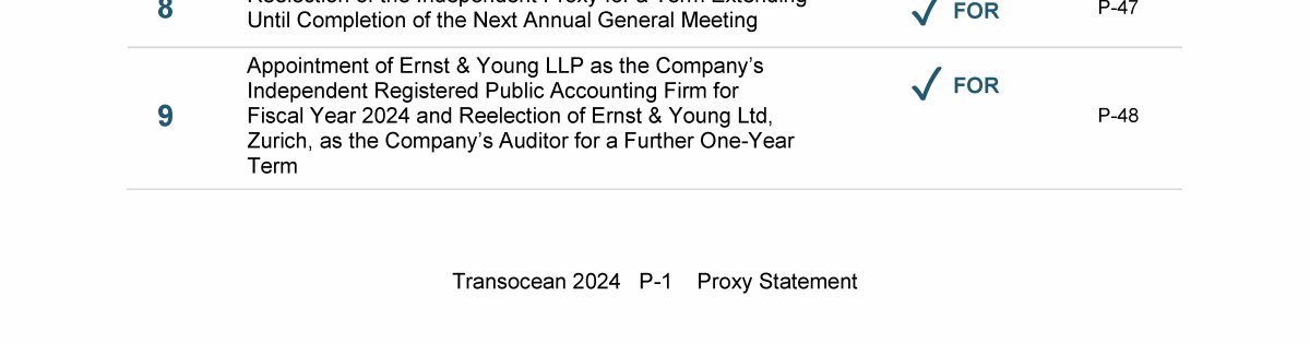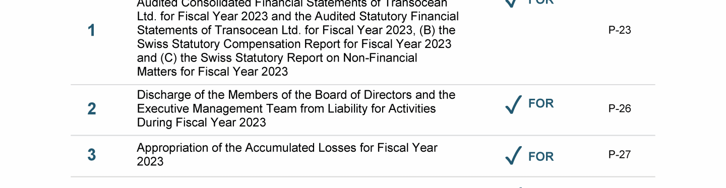 Agenda Item 1. Approval of (A) the 2023 Annual Report, Including the Audited Consolidated Financial Statements of Transocean Ltd. for Fiscal Year 2023 and the Audited Statutory Financial Statements of Transocean Ltd. for Fiscal Year 2023, (B) the Swiss Statutory Compensation Report for Fiscal Year 2023 and (C) the Swiss Statutory Report on Non-Financial Matters for Fiscal Year 2023