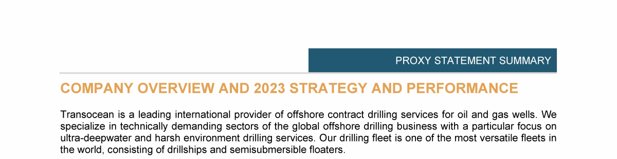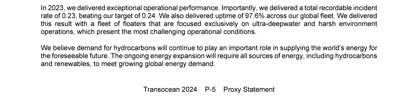 Agenda Item 1. Approval of (A) the 2023 Annual Report, Including the Audited Consolidated Financial Statements of Transocean Ltd. for Fiscal Year 2023 and the Audited Statutory Financial Statements of Transocean Ltd. for Fiscal Year 2023, (B) the Swiss Statutory Compensation Report for Fiscal Year 2023 and (C) the Swiss Statutory Report on Non-Financial Matters for Fiscal Year 2023