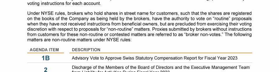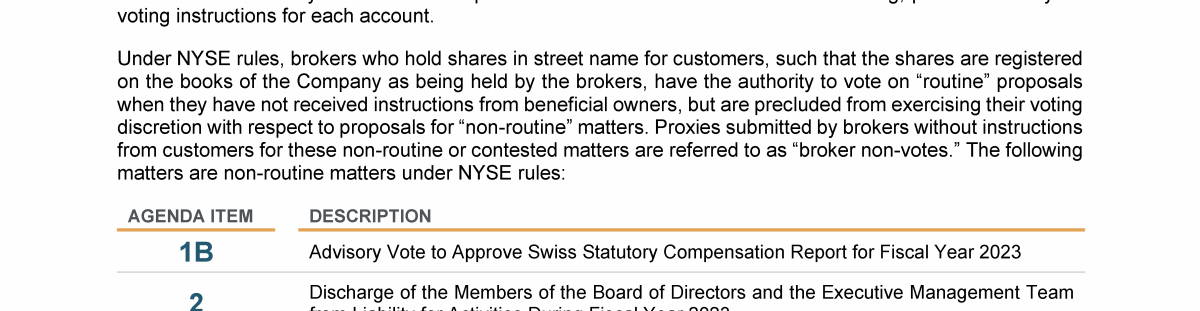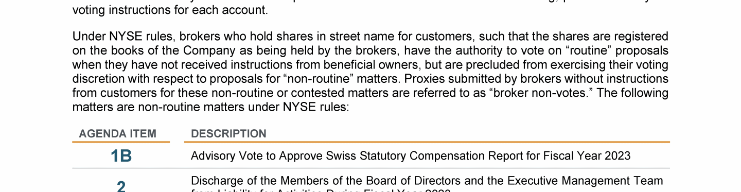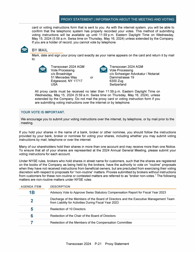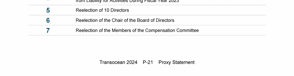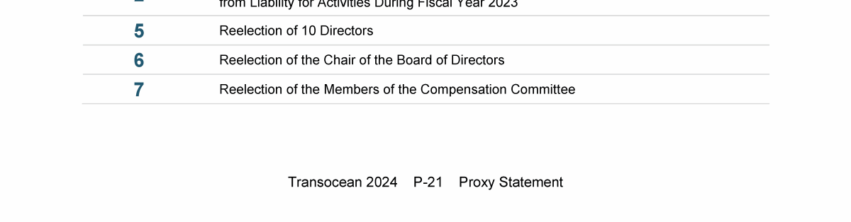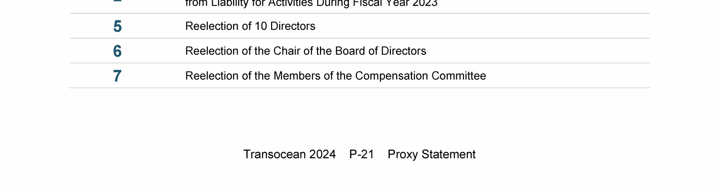 Agenda Item 1. Approval of (A) the 2023 Annual Report, Including the Audited Consolidated Financial Statements of Transocean Ltd. for Fiscal Year 2023 and the Audited Statutory Financial Statements of Transocean Ltd. for Fiscal Year 2023, (B) the Swiss Statutory Compensation Report for Fiscal Year 2023 and (C) the Swiss Statutory Report on Non-Financial Matters for Fiscal Year 2023