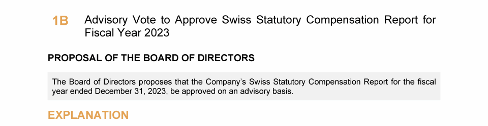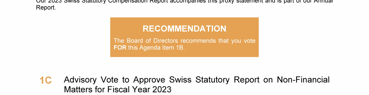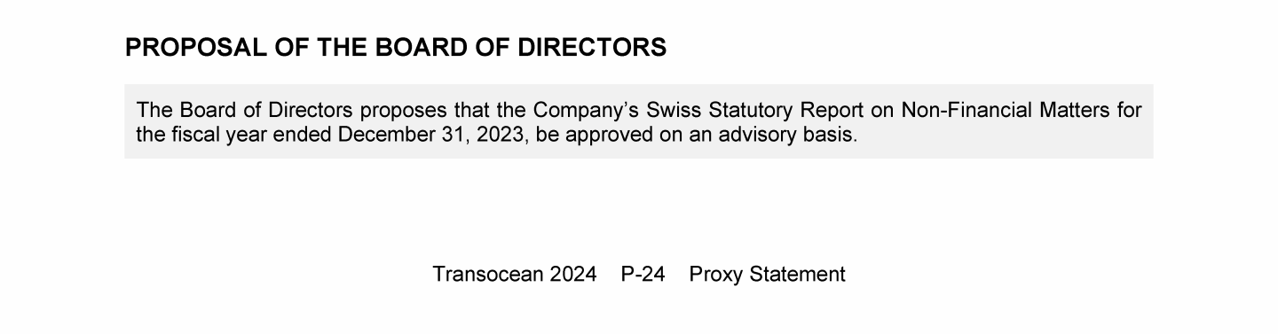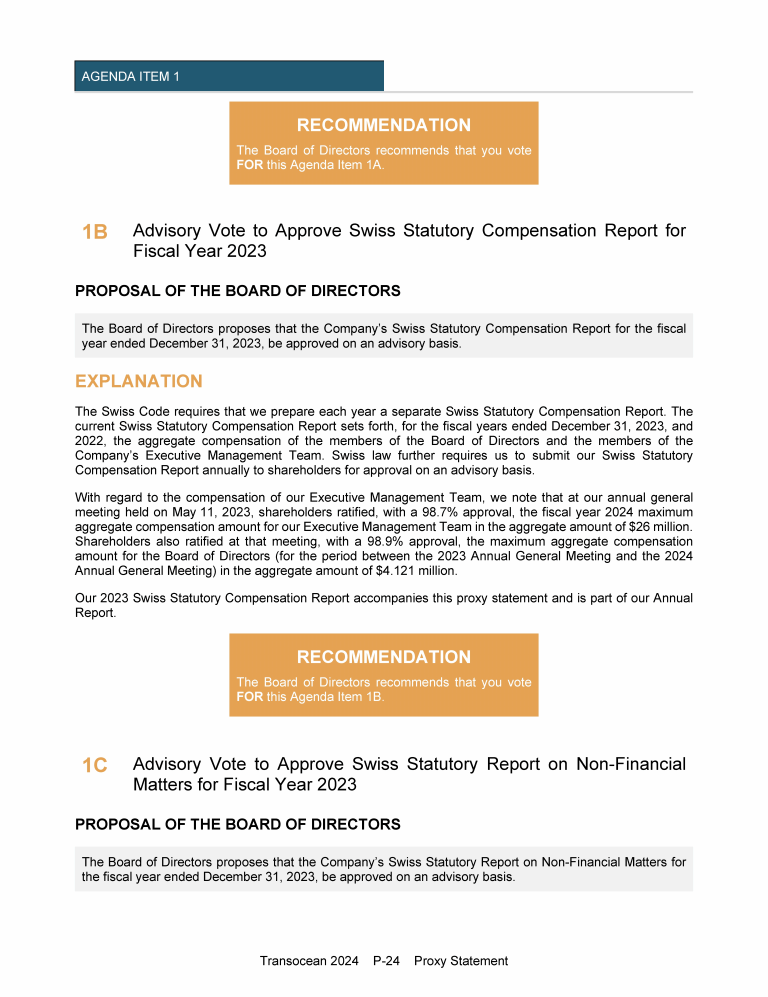 Agenda Item 1. Approval of (A) the 2023 Annual Report, Including the Audited Consolidated Financial Statements of Transocean Ltd. for Fiscal Year 2023 and the Audited Statutory Financial Statements of Transocean Ltd. for Fiscal Year 2023, (B) the Swiss Statutory Compensation Report for Fiscal Year 2023 and (C) the Swiss Statutory Report on Non-Financial Matters for Fiscal Year 2023