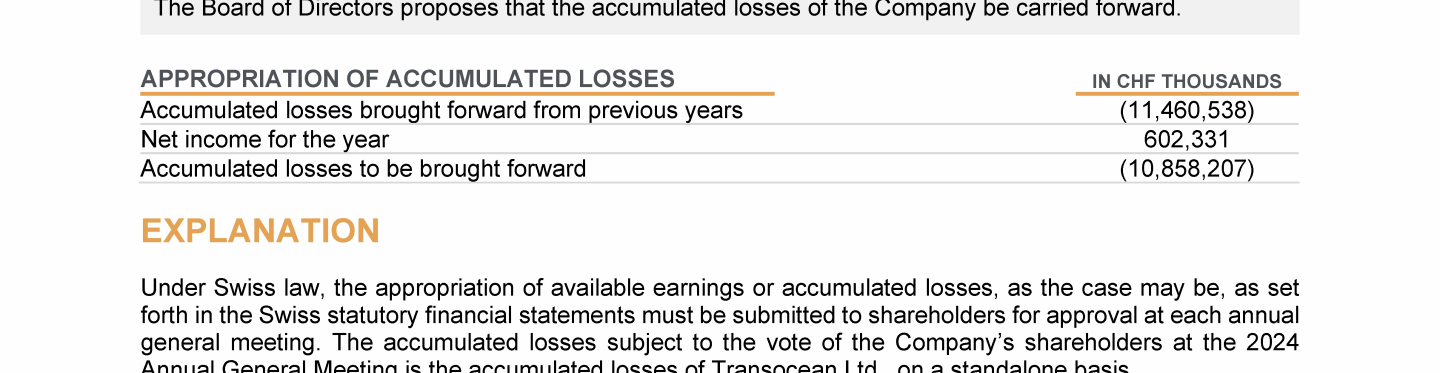 Agenda Item 1. Approval of (A) the 2023 Annual Report, Including the Audited Consolidated Financial Statements of Transocean Ltd. for Fiscal Year 2023 and the Audited Statutory Financial Statements of Transocean Ltd. for Fiscal Year 2023, (B) the Swiss Statutory Compensation Report for Fiscal Year 2023 and (C) the Swiss Statutory Report on Non-Financial Matters for Fiscal Year 2023