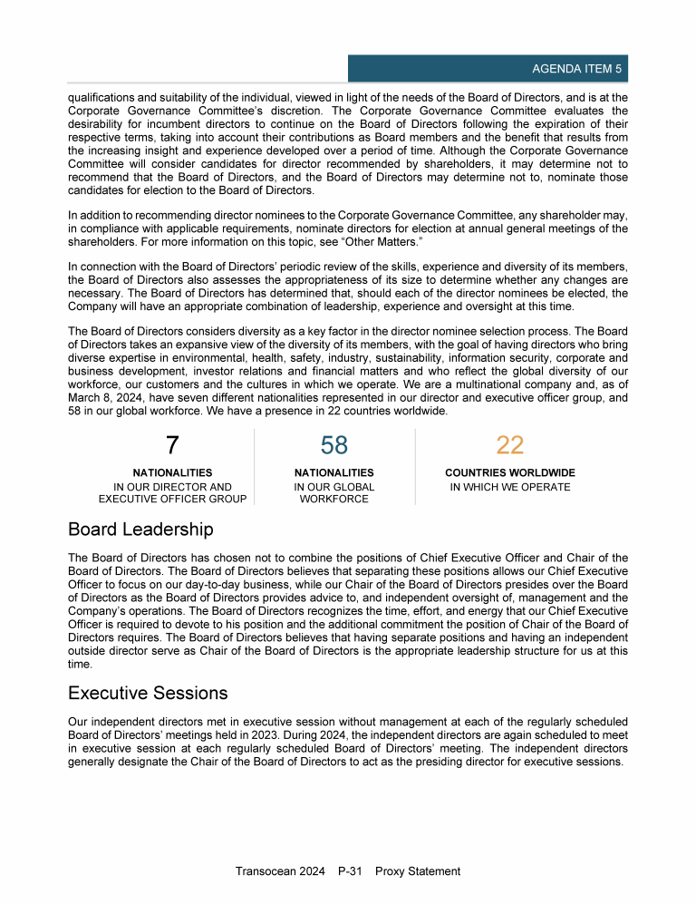 Agenda Item 1. Approval of (A) the 2023 Annual Report, Including the Audited Consolidated Financial Statements of Transocean Ltd. for Fiscal Year 2023 and the Audited Statutory Financial Statements of Transocean Ltd. for Fiscal Year 2023, (B) the Swiss Statutory Compensation Report for Fiscal Year 2023 and (C) the Swiss Statutory Report on Non-Financial Matters for Fiscal Year 2023