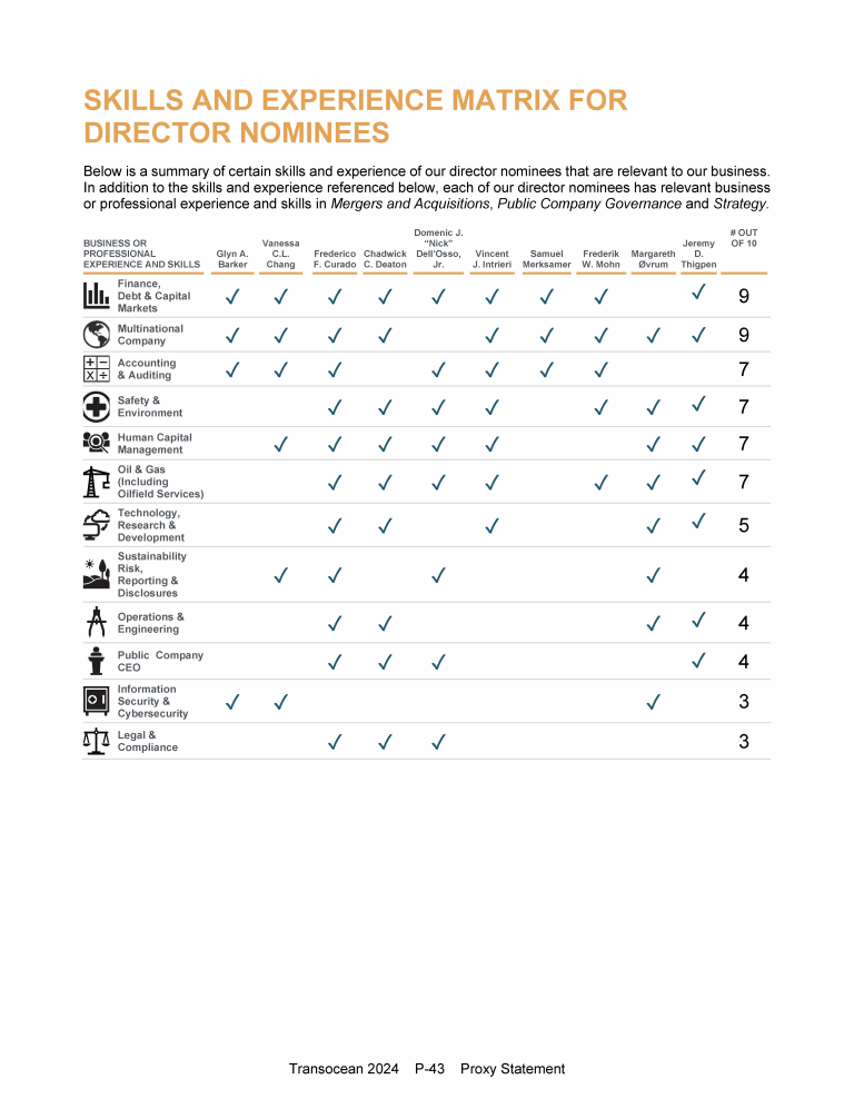 Agenda Item 1. Approval of (A) the 2023 Annual Report, Including the Audited Consolidated Financial Statements of Transocean Ltd. for Fiscal Year 2023 and the Audited Statutory Financial Statements of Transocean Ltd. for Fiscal Year 2023, (B) the Swiss Statutory Compensation Report for Fiscal Year 2023 and (C) the Swiss Statutory Report on Non-Financial Matters for Fiscal Year 2023