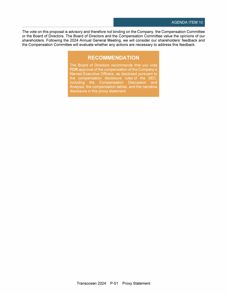 Agenda Item 1. Approval of (A) the 2023 Annual Report, Including the Audited Consolidated Financial Statements of Transocean Ltd. for Fiscal Year 2023 and the Audited Statutory Financial Statements of Transocean Ltd. for Fiscal Year 2023, (B) the Swiss Statutory Compensation Report for Fiscal Year 2023 and (C) the Swiss Statutory Report on Non-Financial Matters for Fiscal Year 2023