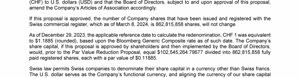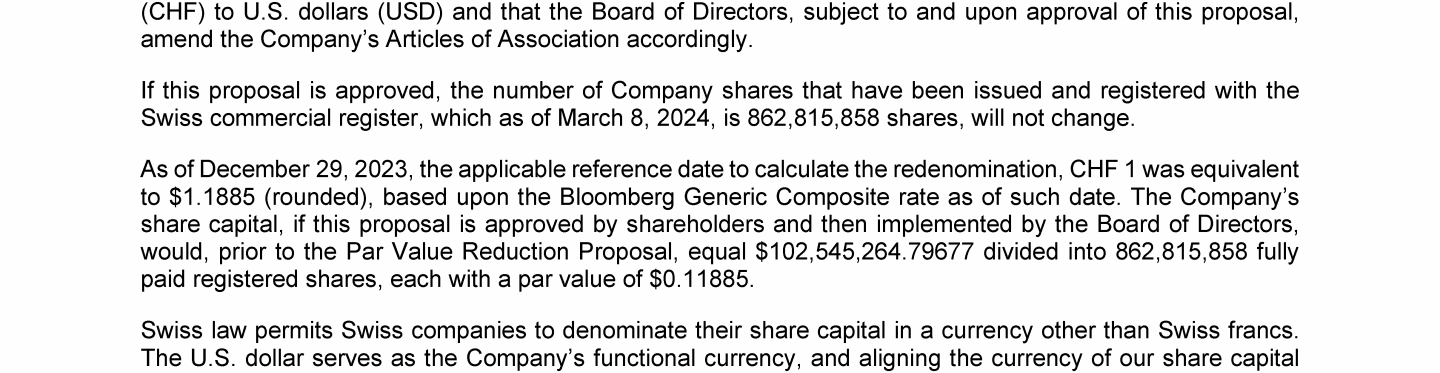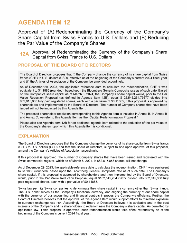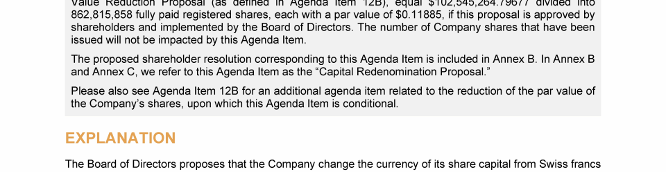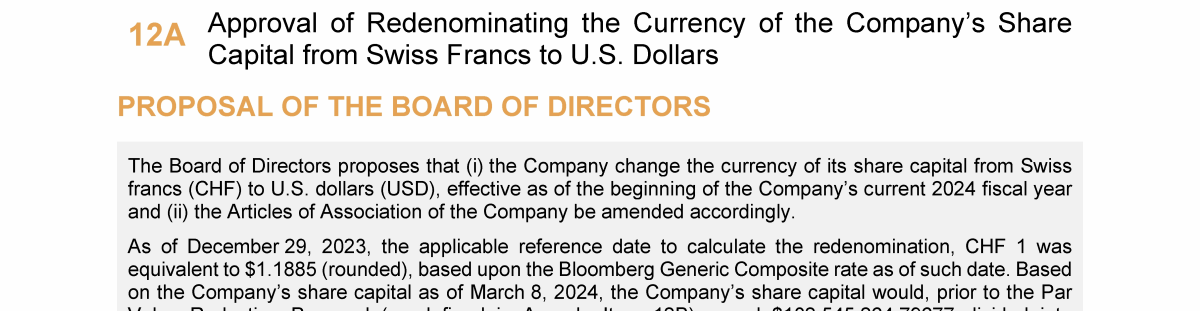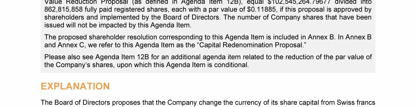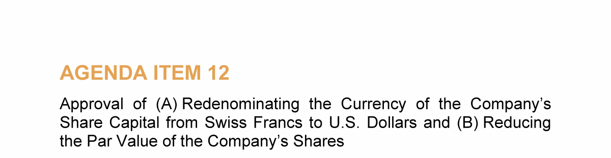 Agenda Item 12. Approval of (A) Redenominating the Currency of the Company's Share Capital from Swiss Francs to U.S. Dollars and (B) Reducing the Par Value of the Company's Shares