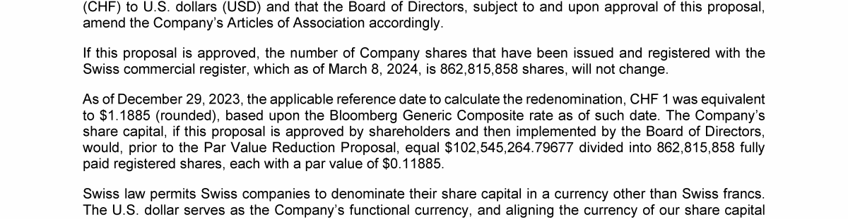 Annex B - Redenomination of the Currency of the Company's Share Capital from Swiss Francs to U.S. Dollars