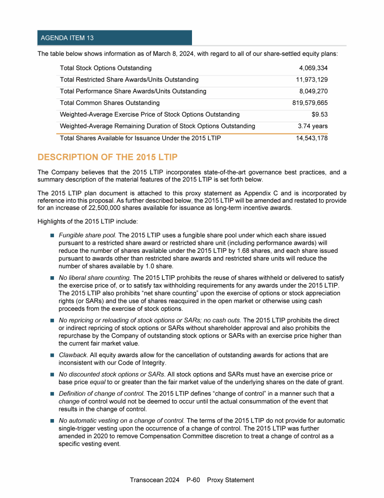 Agenda Item 13. Approval of (A) Amendment and Restatement of Transocean Ltd. 2015 Long-Term Incentive Plan and (B) Capital Authorization for Share-Based Incentive Plans