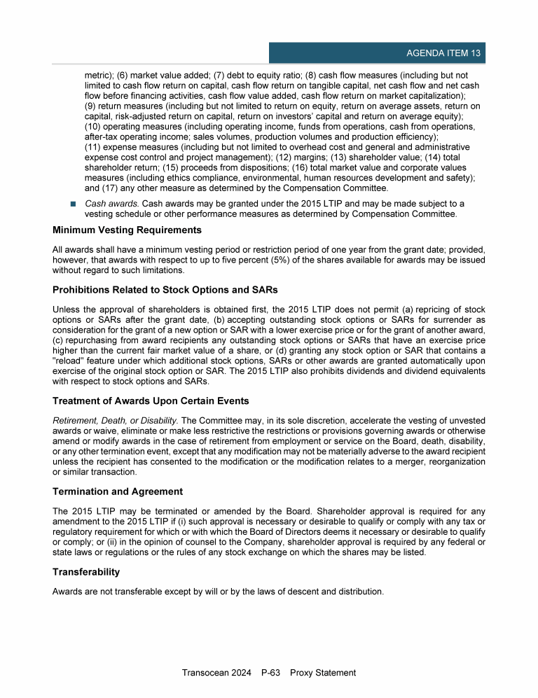 Agenda Item 13. Approval of (A) Amendment and Restatement of Transocean Ltd. 2015 Long-Term Incentive Plan and (B) Capital Authorization for Share-Based Incentive Plans