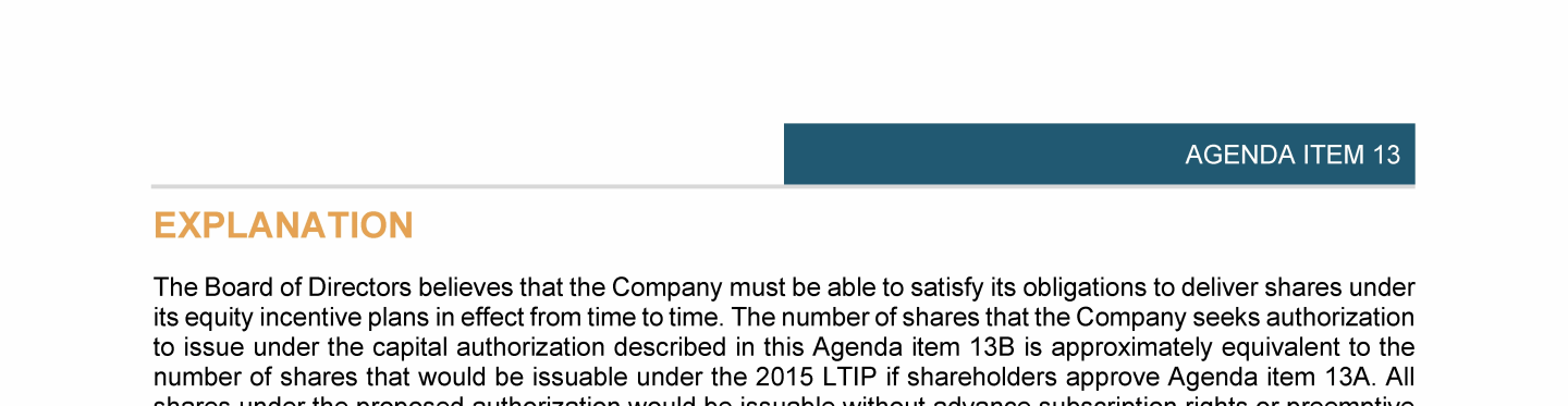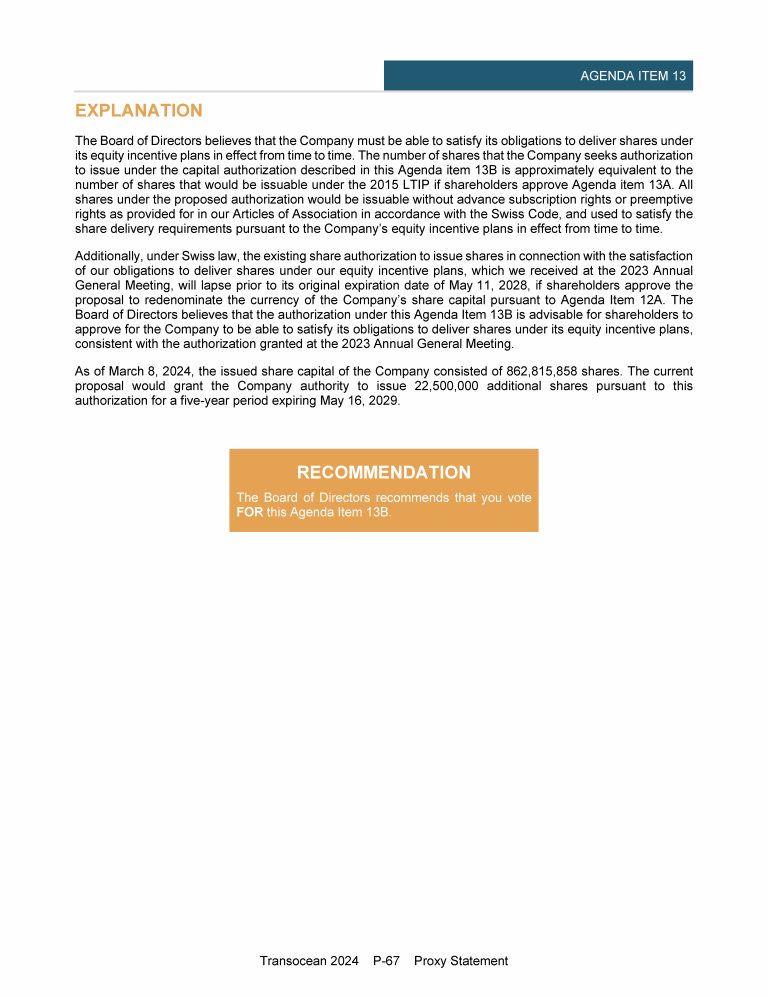 Agenda Item 13. Approval of (A) Amendment and Restatement of Transocean Ltd. 2015 Long-Term Incentive Plan and (B) Capital Authorization for Share-Based Incentive Plans