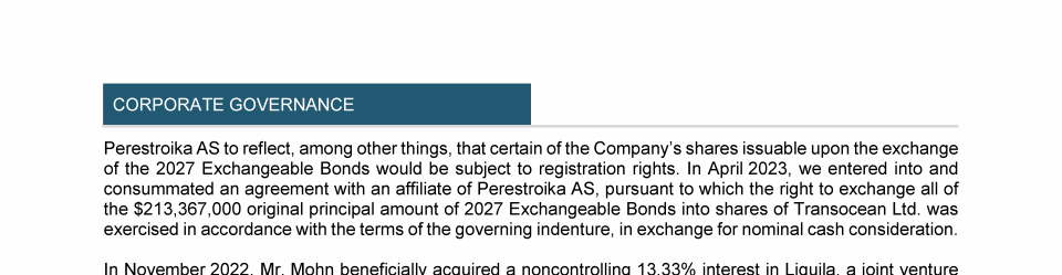 Agenda Item 1. Approval of (A) the 2023 Annual Report, Including the Audited Consolidated Financial Statements of Transocean Ltd. for Fiscal Year 2023 and the Audited Statutory Financial Statements of Transocean Ltd. for Fiscal Year 2023, (B) the Swiss Statutory Compensation Report for Fiscal Year 2023 and (C) the Swiss Statutory Report on Non-Financial Matters for Fiscal Year 2023