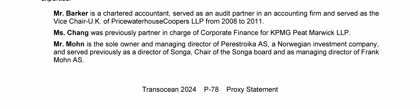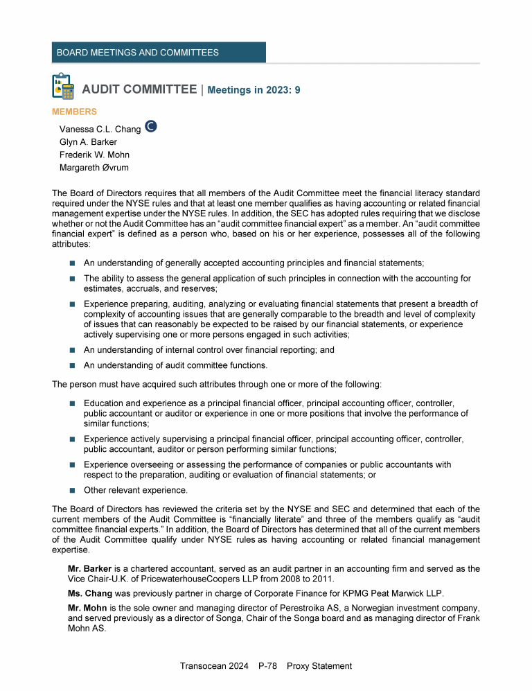 Agenda Item 1. Approval of (A) the 2023 Annual Report, Including the Audited Consolidated Financial Statements of Transocean Ltd. for Fiscal Year 2023 and the Audited Statutory Financial Statements of Transocean Ltd. for Fiscal Year 2023, (B) the Swiss Statutory Compensation Report for Fiscal Year 2023 and (C) the Swiss Statutory Report on Non-Financial Matters for Fiscal Year 2023