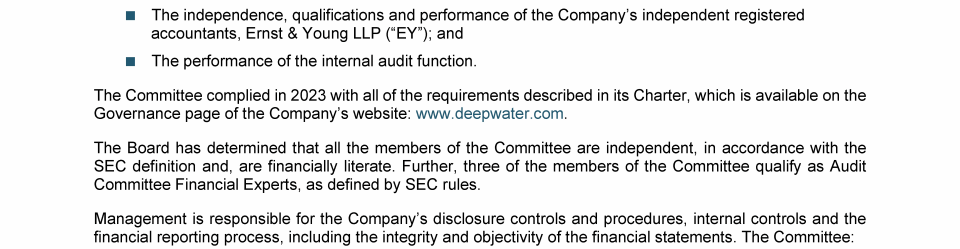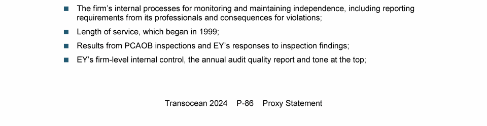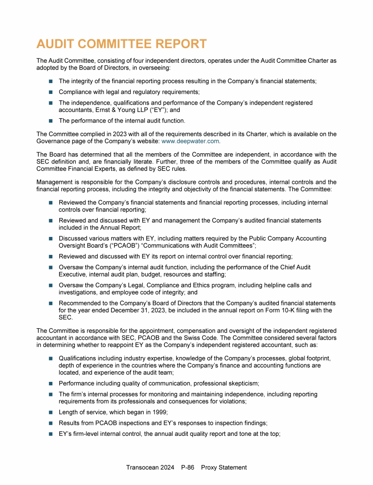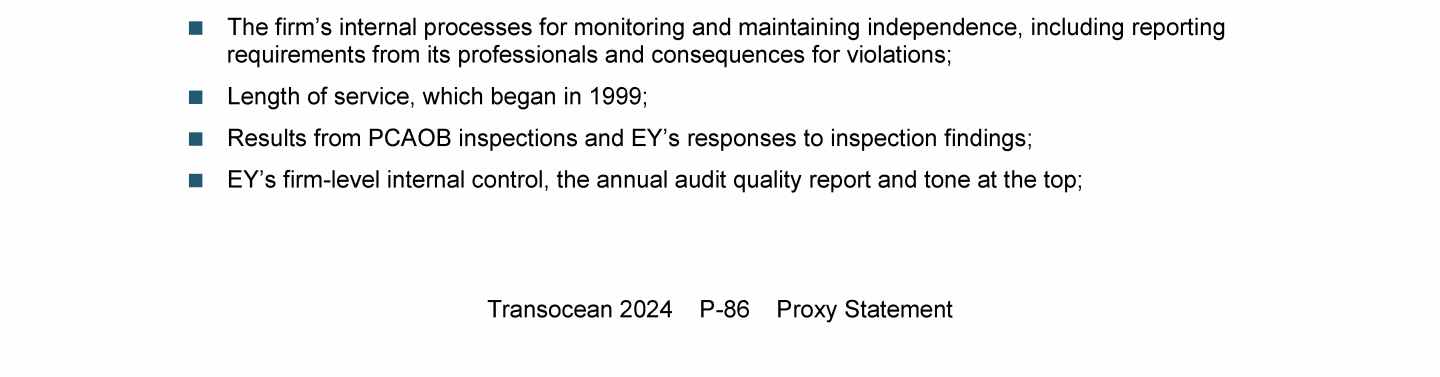 Agenda Item 1. Approval of (A) the 2023 Annual Report, Including the Audited Consolidated Financial Statements of Transocean Ltd. for Fiscal Year 2023 and the Audited Statutory Financial Statements of Transocean Ltd. for Fiscal Year 2023, (B) the Swiss Statutory Compensation Report for Fiscal Year 2023 and (C) the Swiss Statutory Report on Non-Financial Matters for Fiscal Year 2023