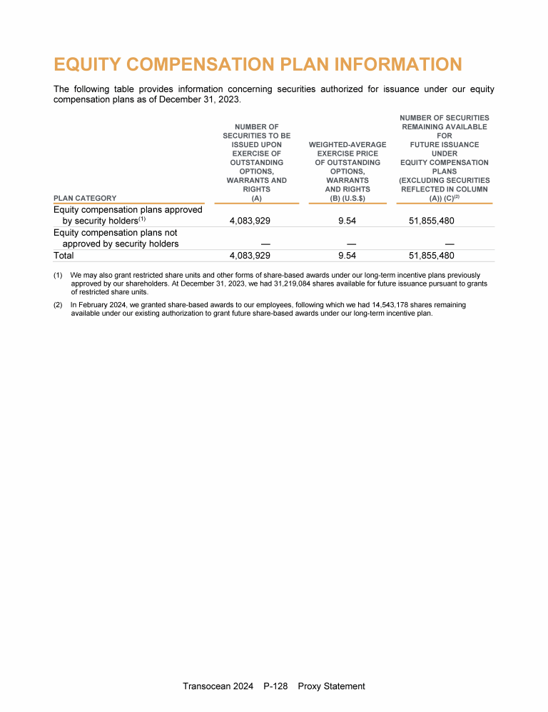 Agenda Item 1. Approval of (A) the 2023 Annual Report, Including the Audited Consolidated Financial Statements of Transocean Ltd. for Fiscal Year 2023 and the Audited Statutory Financial Statements of Transocean Ltd. for Fiscal Year 2023, (B) the Swiss Statutory Compensation Report for Fiscal Year 2023 and (C) the Swiss Statutory Report on Non-Financial Matters for Fiscal Year 2023