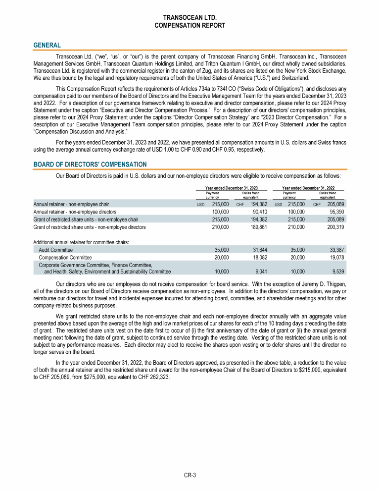 Agenda Item 1. Approval of (A) the 2023 Annual Report, Including the Audited Consolidated Financial Statements of Transocean Ltd. for Fiscal Year 2023 and the Audited Statutory Financial Statements of Transocean Ltd. for Fiscal Year 2023, (B) the Swiss Statutory Compensation Report for Fiscal Year 2023 and (C) the Swiss Statutory Report on Non-Financial Matters for Fiscal Year 2023