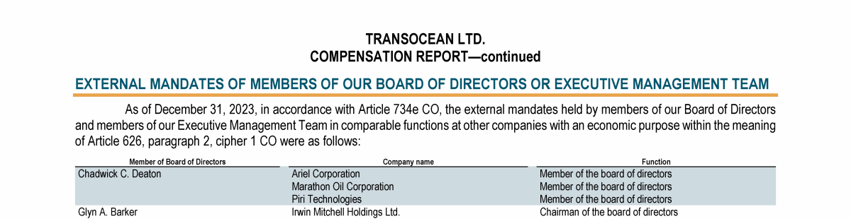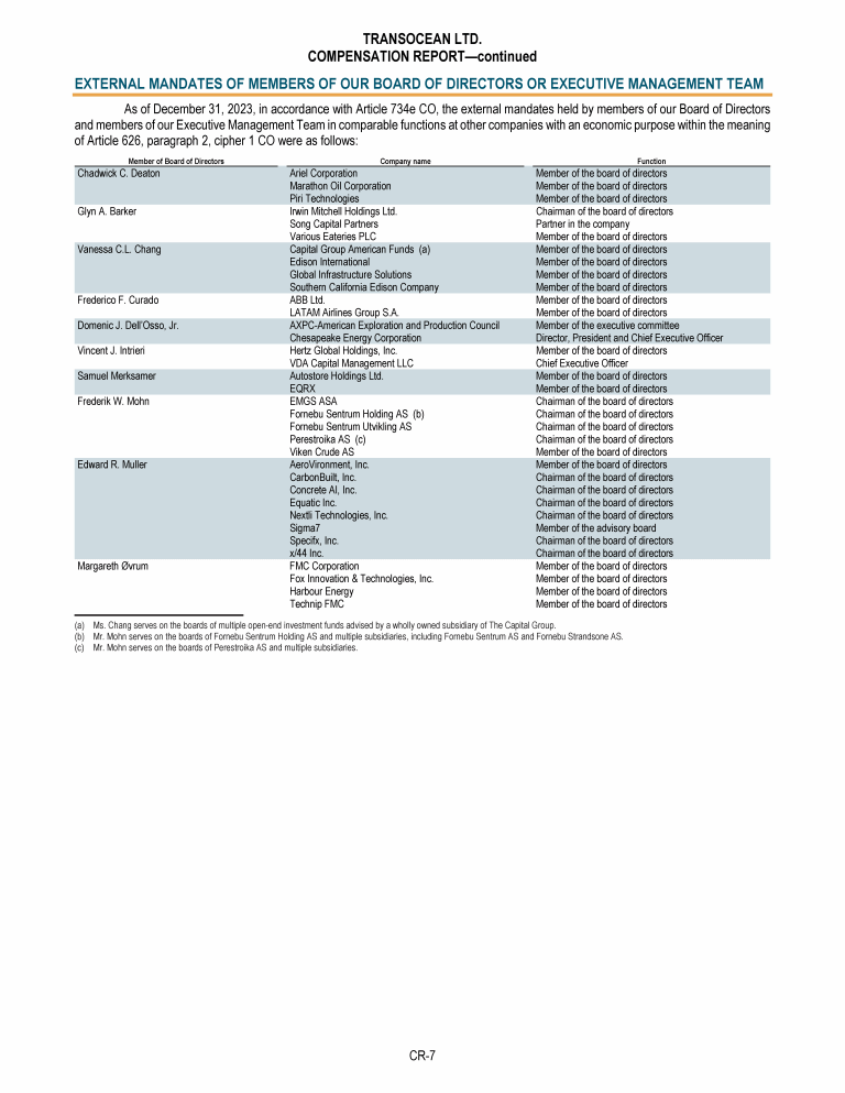 Agenda Item 1. Approval of (A) the 2023 Annual Report, Including the Audited Consolidated Financial Statements of Transocean Ltd. for Fiscal Year 2023 and the Audited Statutory Financial Statements of Transocean Ltd. for Fiscal Year 2023, (B) the Swiss Statutory Compensation Report for Fiscal Year 2023 and (C) the Swiss Statutory Report on Non-Financial Matters for Fiscal Year 2023