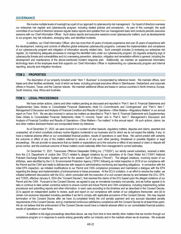Agenda Item 1. Approval of (A) the 2023 Annual Report, Including the Audited Consolidated Financial Statements of Transocean Ltd. for Fiscal Year 2023 and the Audited Statutory Financial Statements of Transocean Ltd. for Fiscal Year 2023, (B) the Swiss Statutory Compensation Report for Fiscal Year 2023 and (C) the Swiss Statutory Report on Non-Financial Matters for Fiscal Year 2023