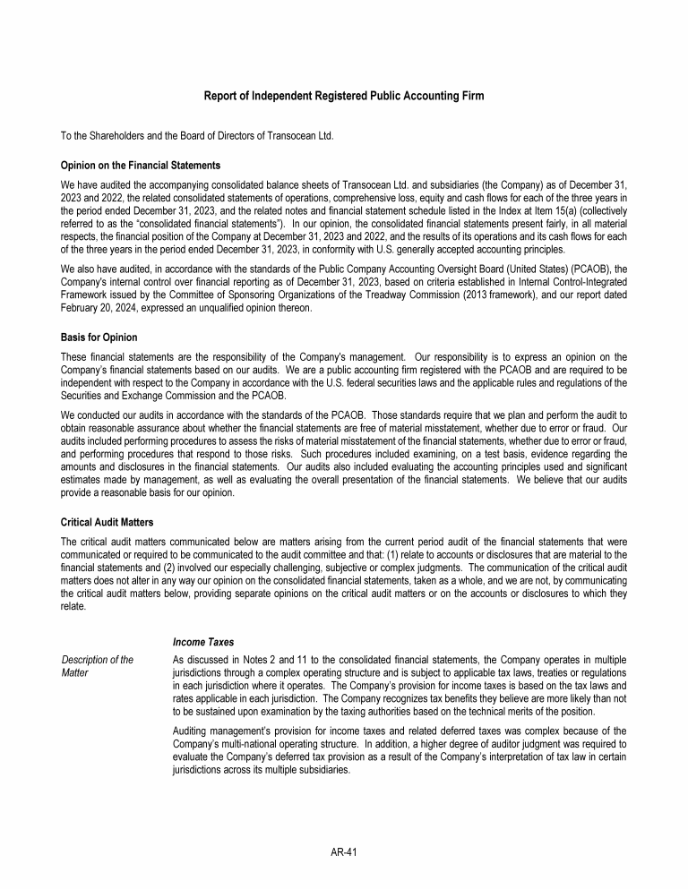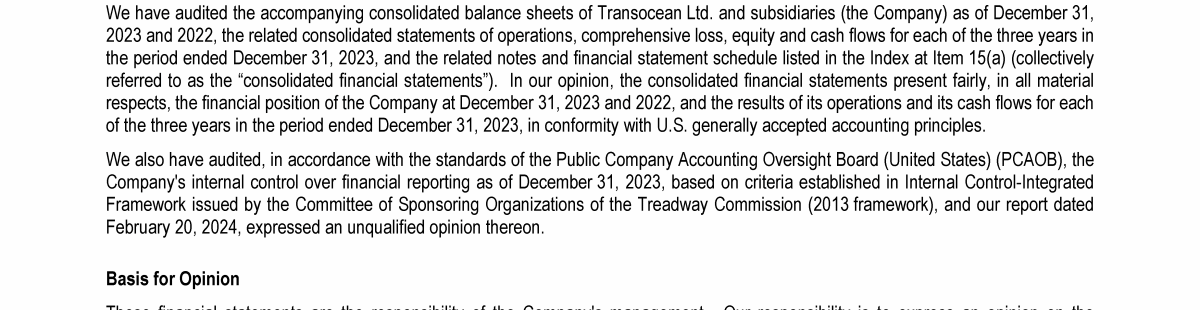 Agenda Item 1. Approval of (A) the 2023 Annual Report, Including the Audited Consolidated Financial Statements of Transocean Ltd. for Fiscal Year 2023 and the Audited Statutory Financial Statements of Transocean Ltd. for Fiscal Year 2023, (B) the Swiss Statutory Compensation Report for Fiscal Year 2023 and (C) the Swiss Statutory Report on Non-Financial Matters for Fiscal Year 2023
