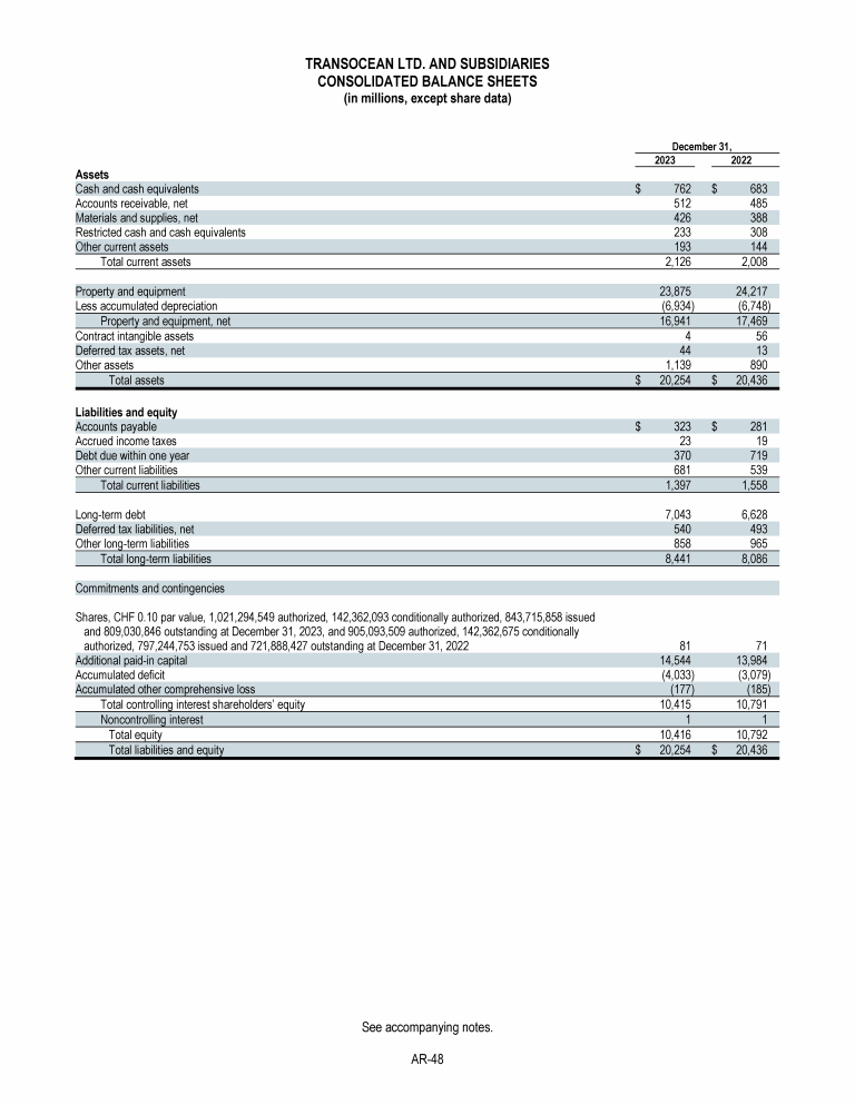 Agenda Item 1. Approval of (A) the 2023 Annual Report, Including the Audited Consolidated Financial Statements of Transocean Ltd. for Fiscal Year 2023 and the Audited Statutory Financial Statements of Transocean Ltd. for Fiscal Year 2023, (B) the Swiss Statutory Compensation Report for Fiscal Year 2023 and (C) the Swiss Statutory Report on Non-Financial Matters for Fiscal Year 2023