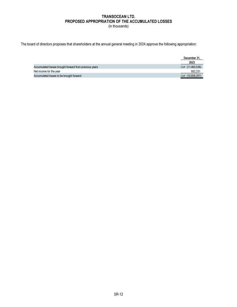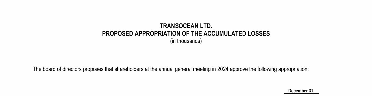 Agenda Item 1. Approval of (A) the 2023 Annual Report, Including the Audited Consolidated Financial Statements of Transocean Ltd. for Fiscal Year 2023 and the Audited Statutory Financial Statements of Transocean Ltd. for Fiscal Year 2023, (B) the Swiss Statutory Compensation Report for Fiscal Year 2023 and (C) the Swiss Statutory Report on Non-Financial Matters for Fiscal Year 2023