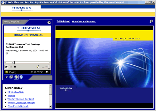 Benefit from powerful audience participation while you listen and watch a live presentation. Download supporting materials, ask the speaker pertinent questions, and email a friend, peer, or colleague to participate as an audience member of the webcast. You can listen to the webcast at a future date from the company's website and easily navigate to indexed highlights of the webcast.